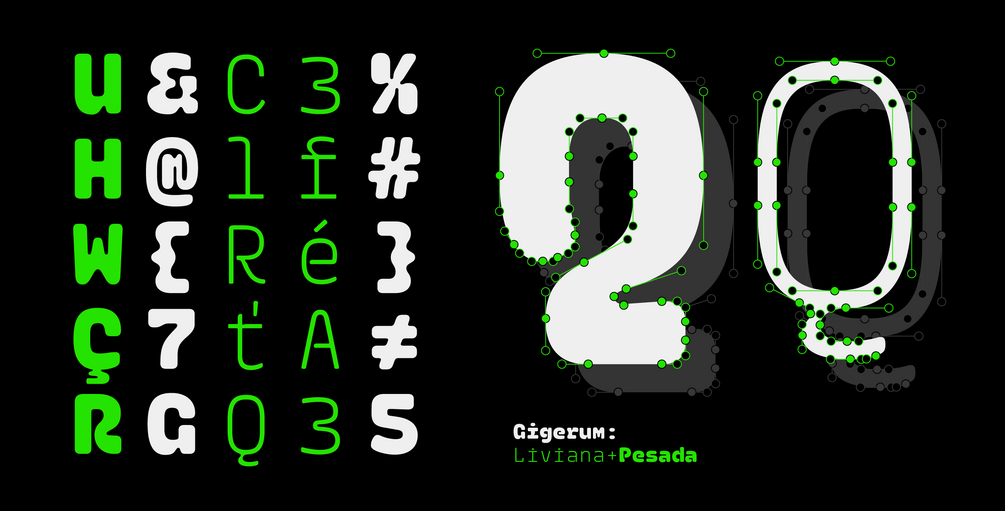 Gigerium consists of a pair of monospaced fonts with rounded edges, meticulously crafted from its heaviest variant, which embraced the challenge of sculpting each letter in individual linoleum blocks. The lighter weight features morphological differences in some letters, making them not only complementary but also distinct. Thus, the typography comprises various explorations, highlighting its open counterforms.
