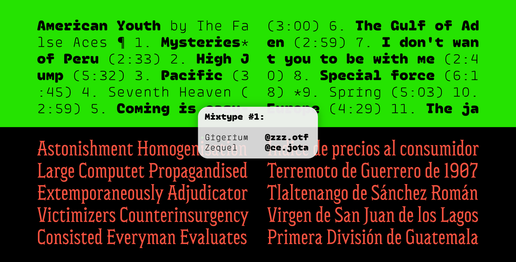 Como en Mixtypes buscamos compartir proyectos a pura ansiedad, las tipografías cuentan con un set reducido de caracteres que prioriza la cobertura de lenguas sudamericanas, pero que de paso permite escribir en idiomas extranjeros como inglés, francés o italiano (alemán no, no hicimos el "esset"). Además incluye números y signos de puntuación.